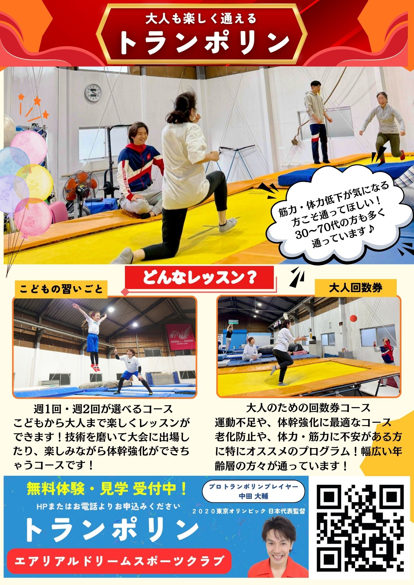 私が競技者として、また指導者として学んだスポーツのノウハウを全て注ぎ込み、子供たちにスポーツを通じて学ぶべきこと、挑戦することの大切さを伝えたいと思っております。もちろんトランポリンというスポーツの楽しさも生かし、大人の方々へのプログラムもご用意しております。