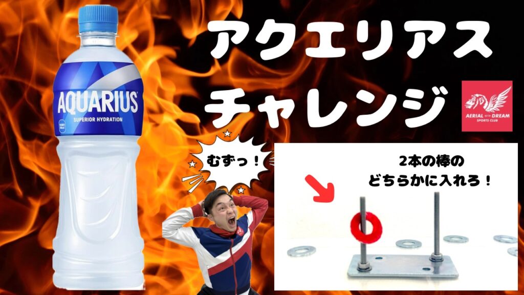2026年2月14日より来館一回につき一回のチャレンジができます!水槽に穴あきコインを落とし、2本の棒のどちらかに入ったらチャレンジ成功!アクエリアス1本がもらえます!楽しみながらレッスンもがんばろうエアリアルドリームスポーツクラブ